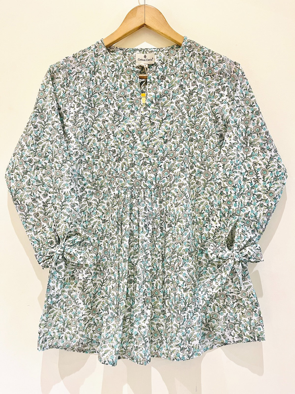 Soft Indian cotton cambric 60's top, block printed by local artisans in Jaipur, India. Regular fit, 3/4 sleeves, V neck and Yoke Style Kurti. Ships in 2-3 working days. True to size. Model wears size 'S'.