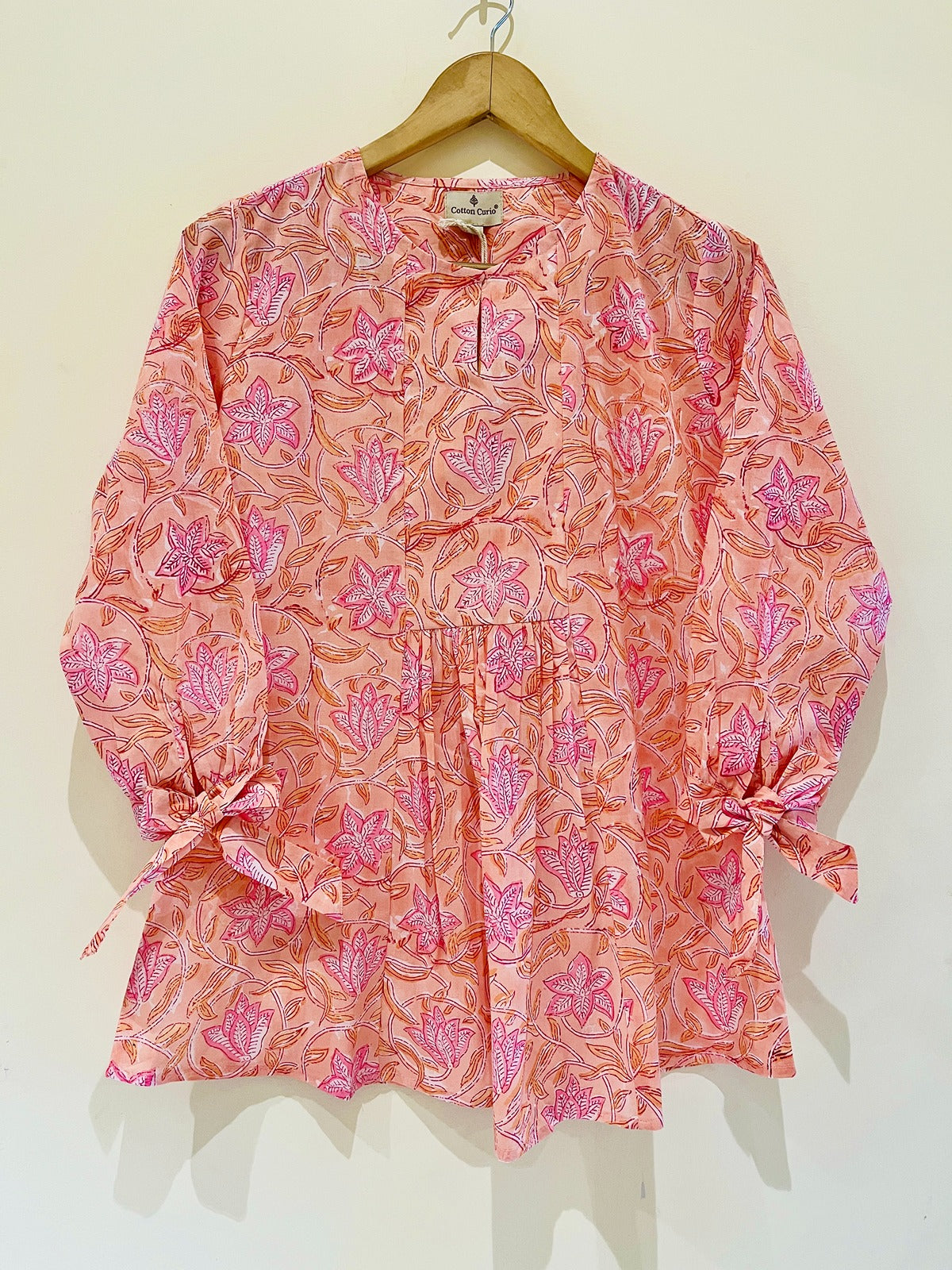 Soft Indian cotton cambric 60's top, block printed by local artisans in Jaipur, India. Regular fit, 3/4 sleeves, V neck and Yoke Style Kurti. Ships in 2-3 working days. True to size. Model wears size 'S'.