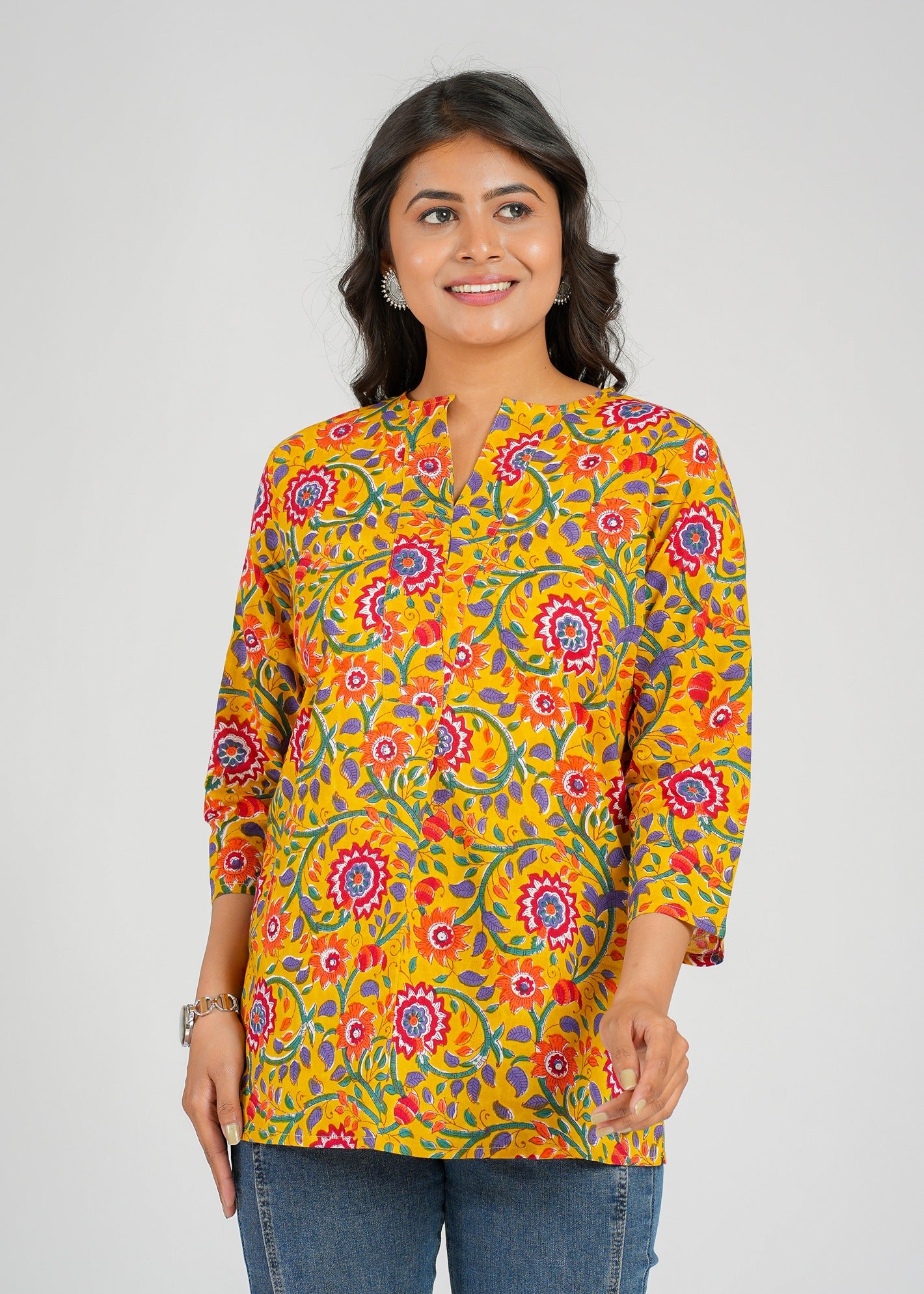 Hand block printed in soft cotton, this straight kurti features a front yoke with a V-neckline and a box pleat for ease. Side splits and 3/4th sleeves add comfort and movement—perfect for everyday elegance.