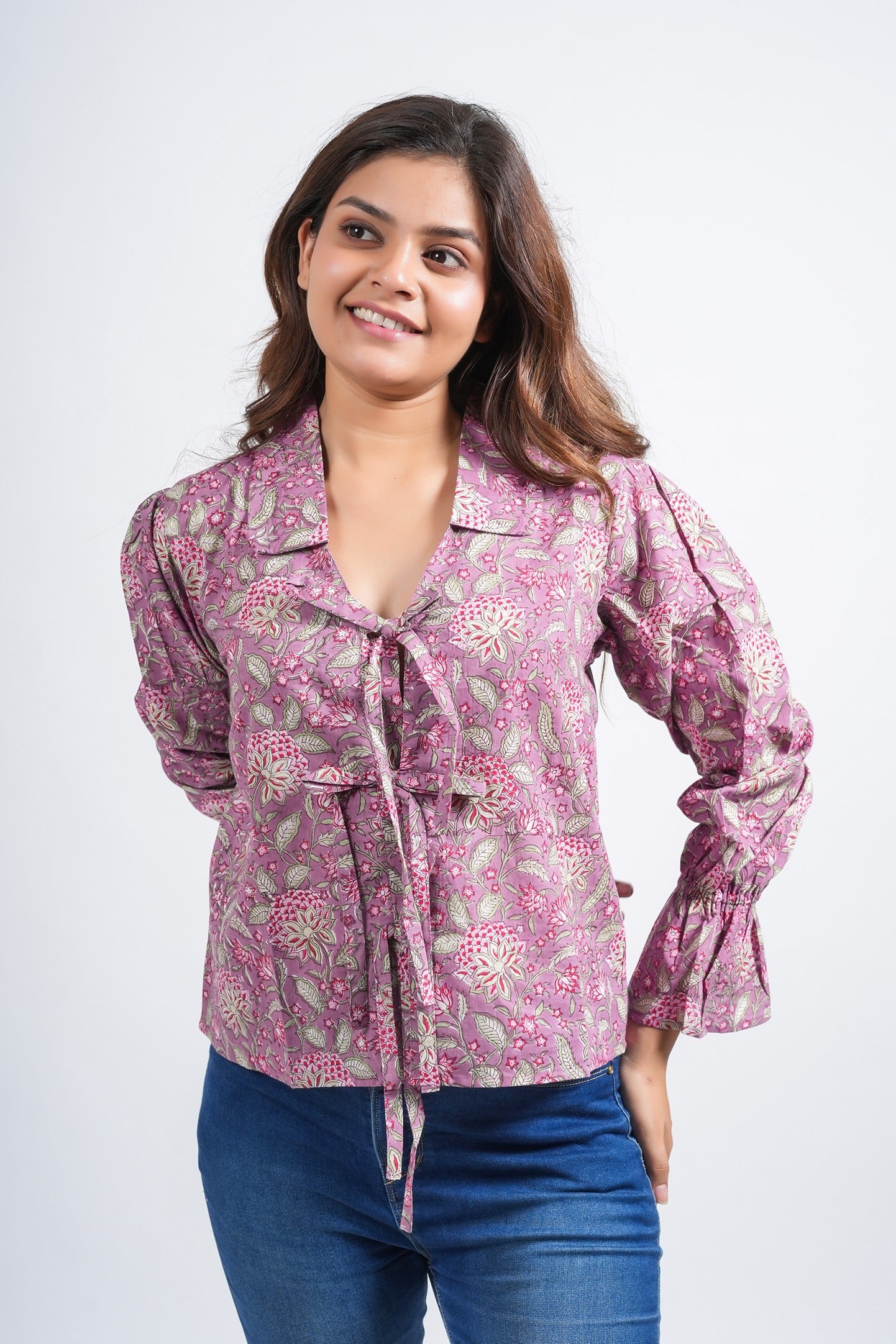 Embrace timeless elegance with the Orchid Grace Tie-Up Top. Featuring a rich plum base adorned with intricate floral and leafy patterns in soft green and ivory, this piece strikes the perfect balance between bold and feminine. The tie-up front detail adds a touch of charm, while the full gathered sleeves with flared cuffs bring a graceful silhouette. Crafted from breathable cotton, it ensures comfort throughout the day while keeping you effortlessly stylish. Ideal for casual outings, coffee dates, or festive gatherings, this versatile top pairs beautifully with denim, skirts, or tailored trousers. The length is just right at 22-25", perfect for pairing with your favorite high-waisted jeans. Ships within 5-7 days.