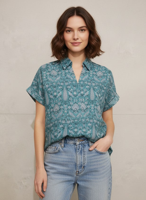 The Teal Paisley Cotton Shirt features an elegant paisley-inspired print in soothing teal tones. Made from 100% soft cotton, it offers a breathable and lightweight feel for all-day comfort. Designed with short sleeves, a collared neckline, and a relaxed fit, this shirt blends traditional charm with modern ease—perfect for casual outings or everyday wear.