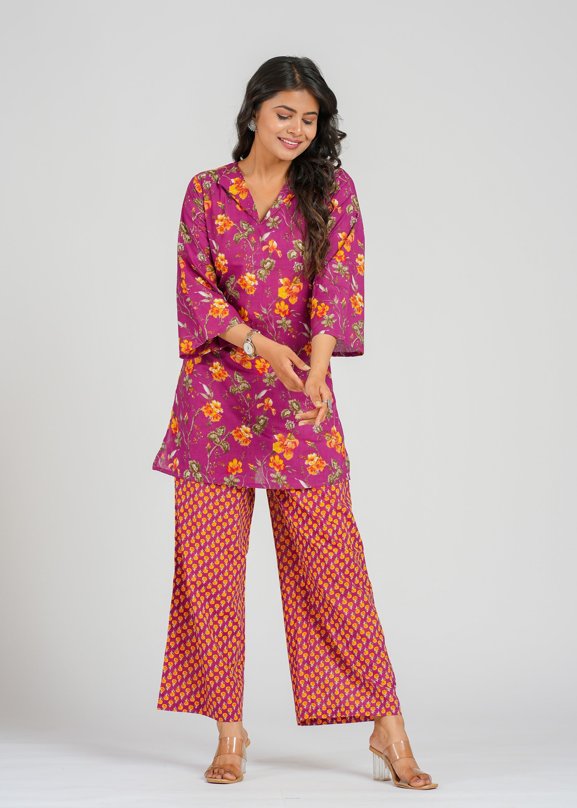 Embrace the airy freedom of our relaxed-fit knee-length kurta, featuring wide, flared sleeves that allow you to move with ease. Paired with half-elasticated, wide-leg, full-length pants, this set offers both style and comfort. The convenience of dual side pockets adds practicality to this chic ensemble.
