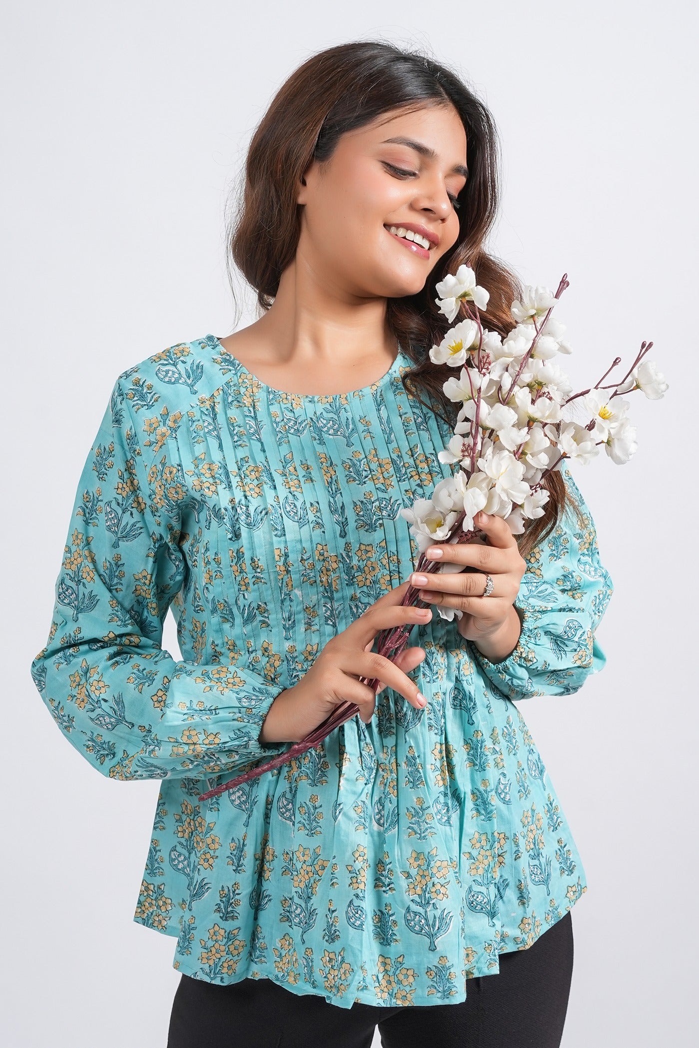 Soft Indian cotton cambric 60's top, block printed by local artisans in Jaipur, India. Regular fit, 3/4 sleeves, round neck with ties. Ships in 2-3 working days. True to size. Model wears size 'S'.