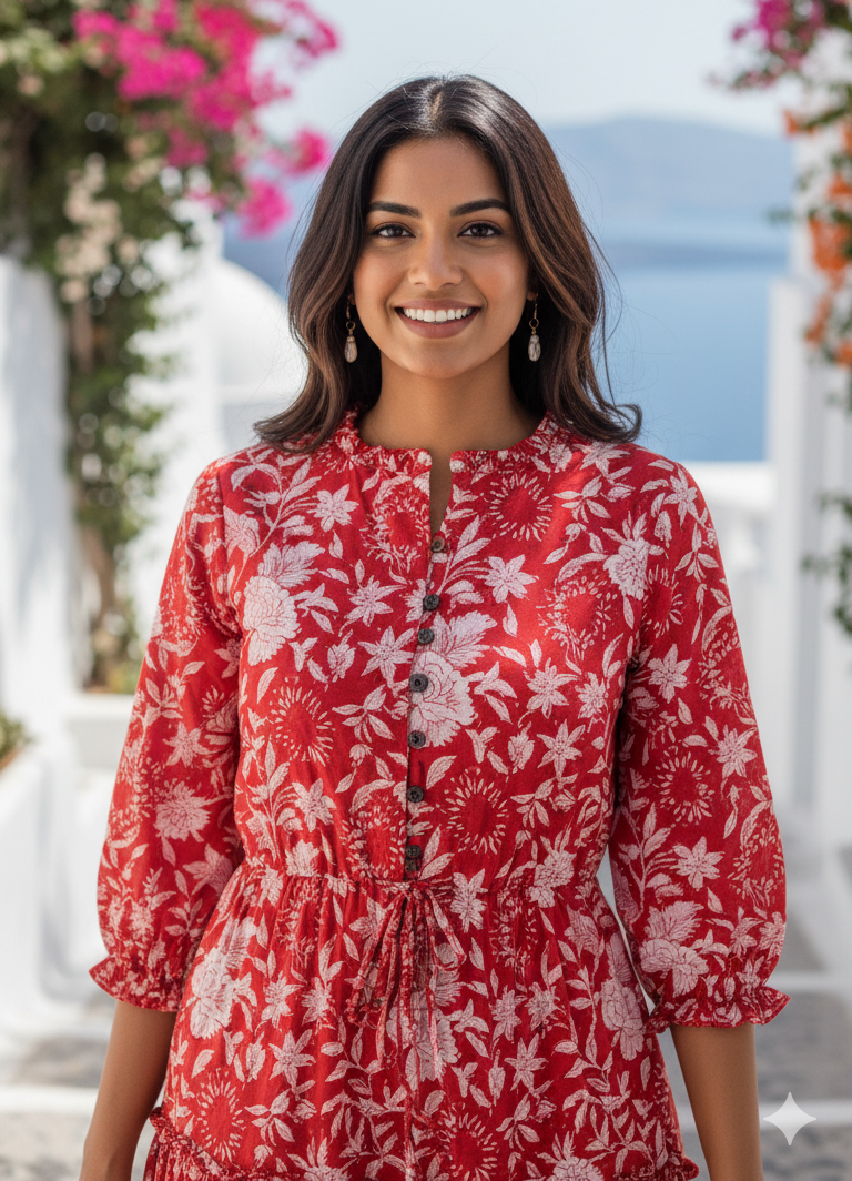 A captivating midi dress in a rich crimson hue, adorned with delicate floral patterns. Featuring three-quarter puff sleeves, a drawstring waist for a customizable fit, and a tiered skirt that flows gracefully with every step. Crafted from lightweight, breathable fabric, this dress is perfect for daytime gatherings or casual strolls. Pair with sandals and a woven bag for an effortlessly elegant ensemble.