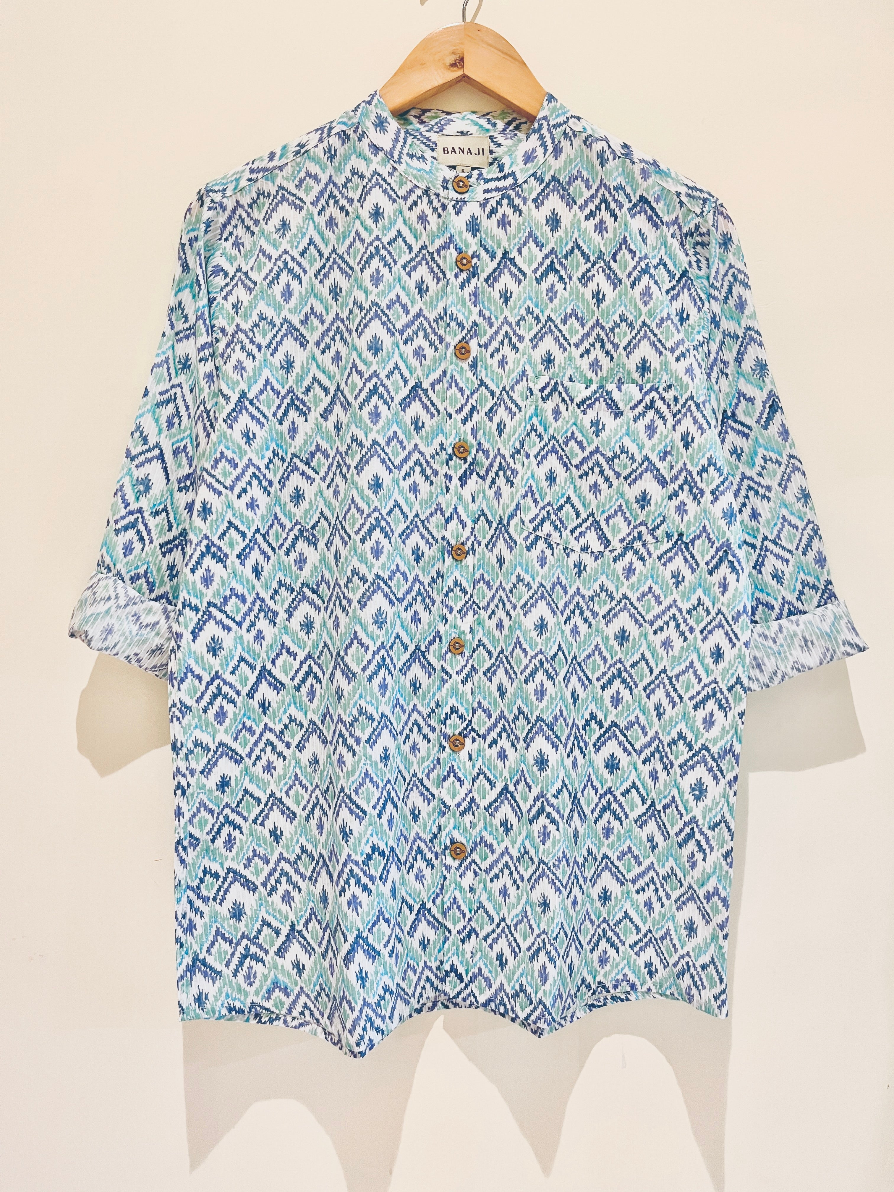 Introducing a must-have addition to your modern wardrobe: an eye-catching, pure cotton block-printed shirt designed for men. This shirt boasts full sleeves, a front pocket, and a stylish Mandarin collar.