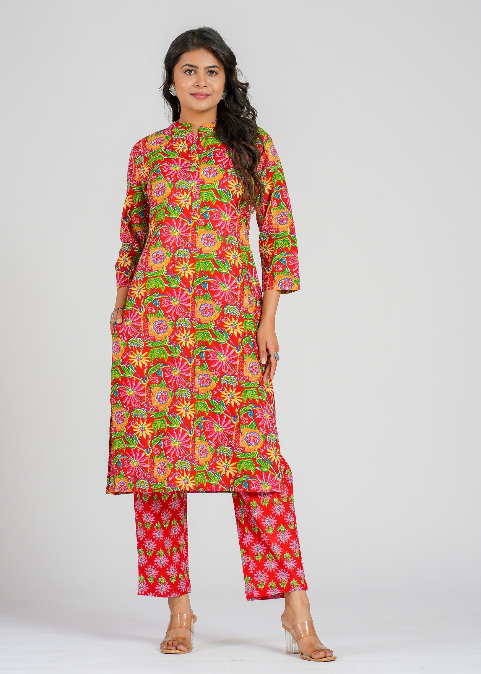 Elevate your everyday look with our Printed Cotton Straight Kurta, featuring a classic collar and 3/4 sleeves for a refined touch. Made from breathable cotton, it’s perfect for all-day comfort. Paired with coordinated narrow pants with two side pockets, this set blends ease with elegance. Model wears size 'S'. Ships in 3–5 working days.