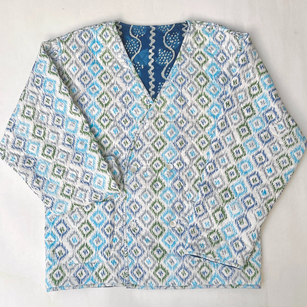 Elevate your winter wardrobe with our 100% hand-block printed reversible cotton quilt jacket. Crafted with love, this jacket is filled with soft, breathable cotton for ultimate comfort and warmth. Its oversized fit, full sleeves, and practical pockets on each side make it both stylish and functional. The jacket falls just below the waist, with a flattering length of 25" to 27", and the reversible design offers versatility, giving you two stunning looks in one. Perfect for layering over casual or formal outfits, this piece seamlessly blends tradition with contemporary style.