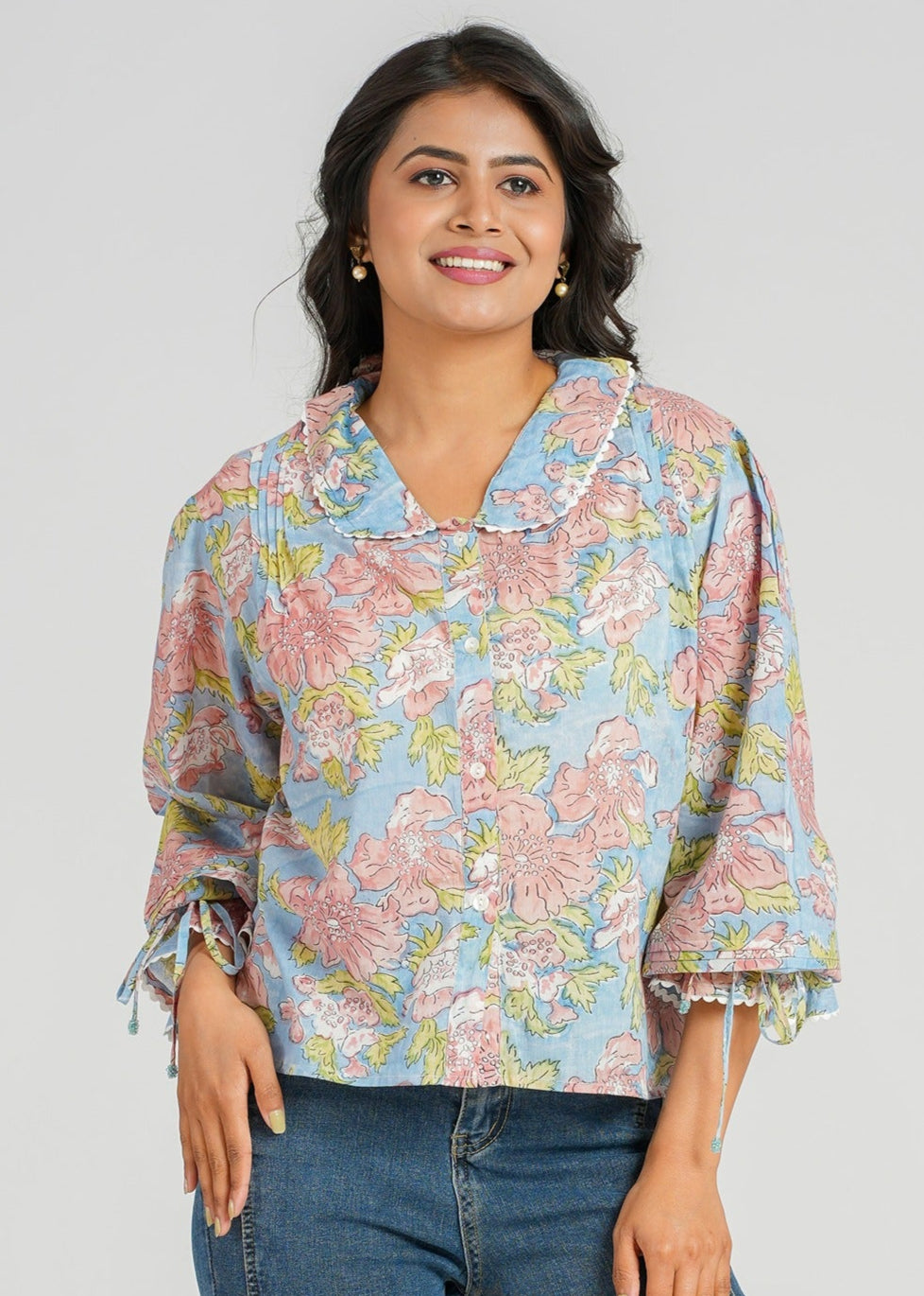 Crafted with love and tradition, this hand block printed cotton short top is a timeless blend of heritage and charm. Featuring delicate lace details, soft gathered sleeves with playful tie-ups, and beaded drawstrings that add a touch of whimsy. The button-down front and round collar adorned with intricate lace make it effortlessly chic.