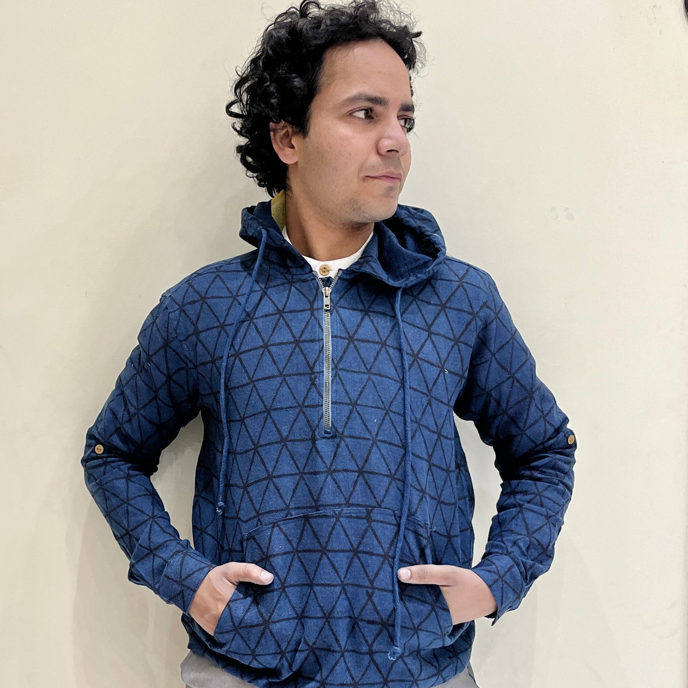 Introducing our Kala Cotton Indigo Printed Hoodie – a winter essential for both men and women. Crafted with care using sustainable Kala Cotton, this hoodie features a captivating geometric pattern created through traditional hand block-printing.