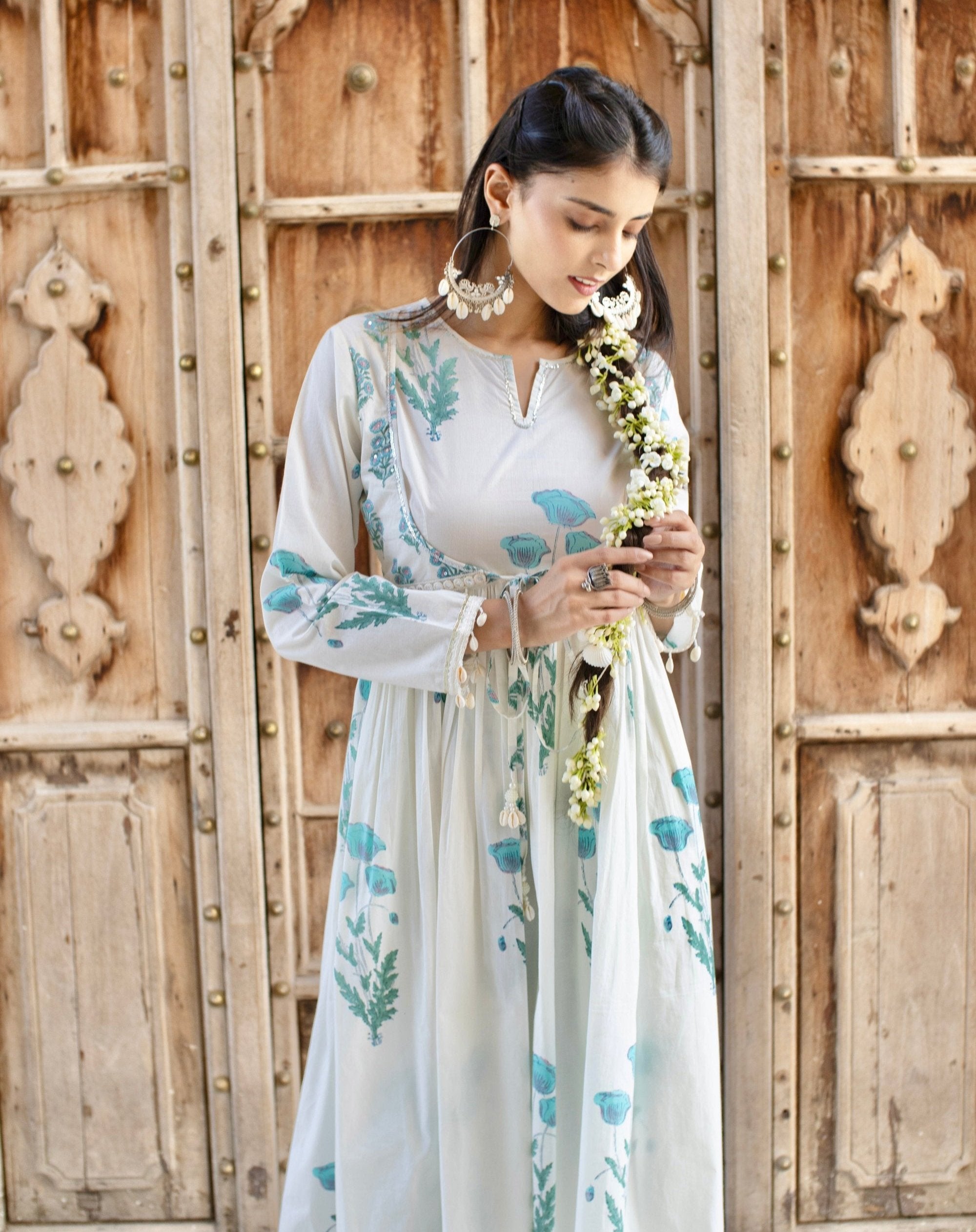 This exquisite long suit set features soft hues of white, light blue, and pastel pink, crafted in delicate hand block-printed patterns for a look that is both refreshing and graceful. The suit is adorned with subtle silver sequins and shell detailing, adding a refined sparkle that enhances the elegance of the ensemble without overpowering its gentle tones. This versatile outfit is perfect for daytime events or understated festive occasions, offering a beautiful fusion of comfort and sophistication