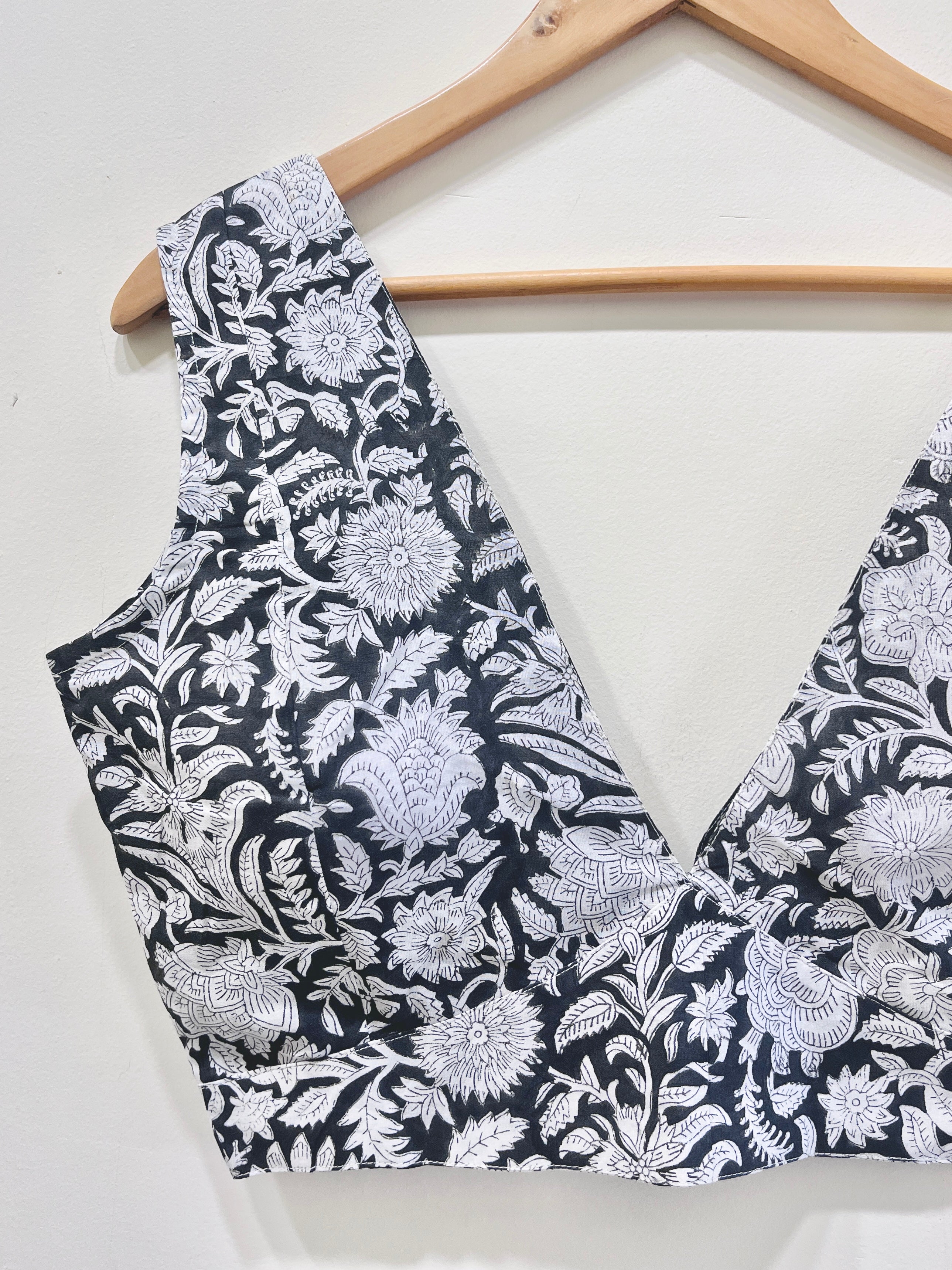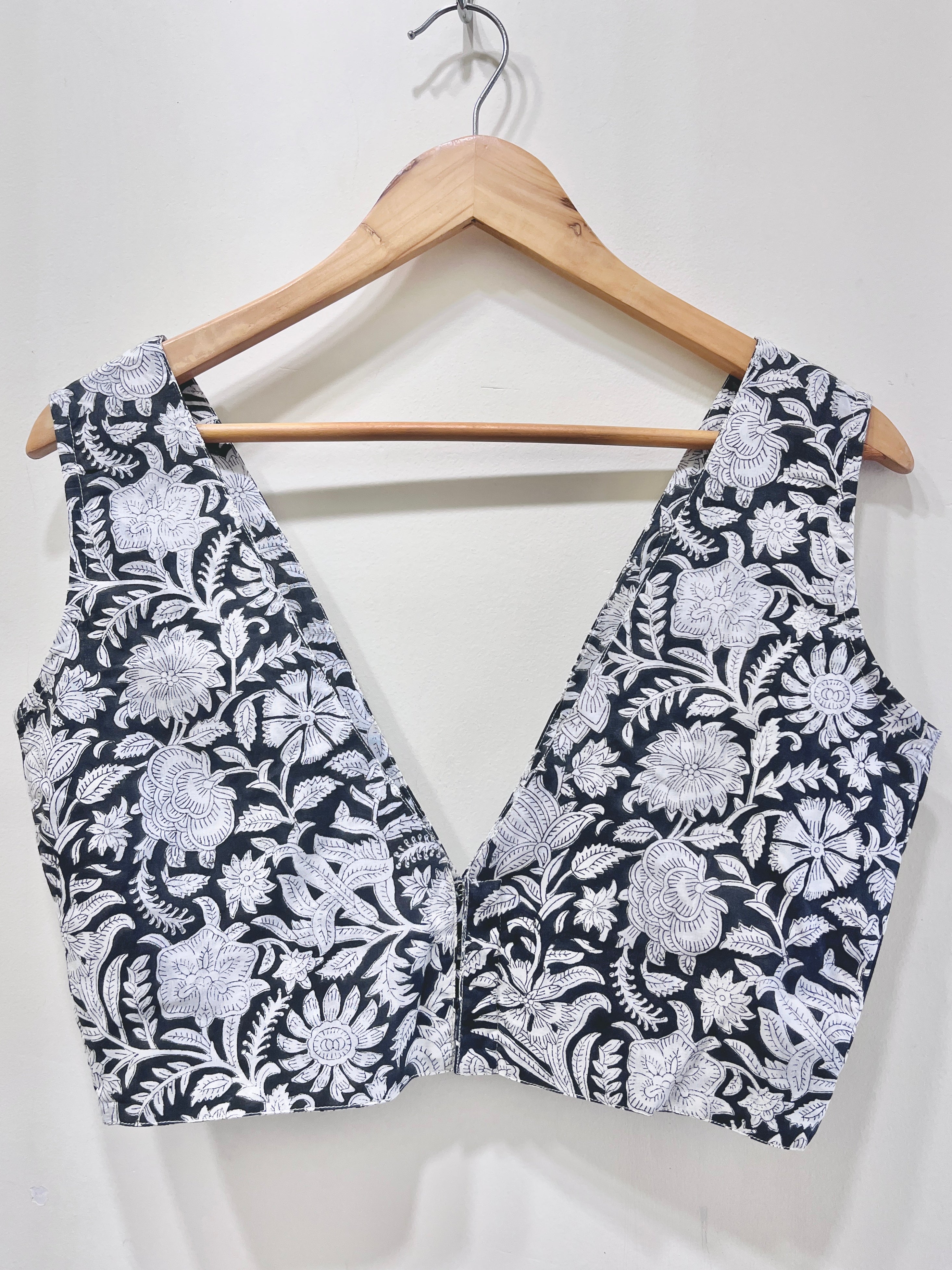 This chic padded blouse features a bold deep V-neck design that perfectly blends elegance with modern style. The black base is beautifully contrasted with intricate white floral prints, giving it a timeless and sophisticated look. Crafted from soft, breathable fabric, it ensures comfort and a flattering fit. The sleeveless cut allows ease of movement, making it ideal for pairing with sarees or lehengas for festive occasions, parties, or casual gatherings. A versatile and stylish addition to your ethnic wardrobe.