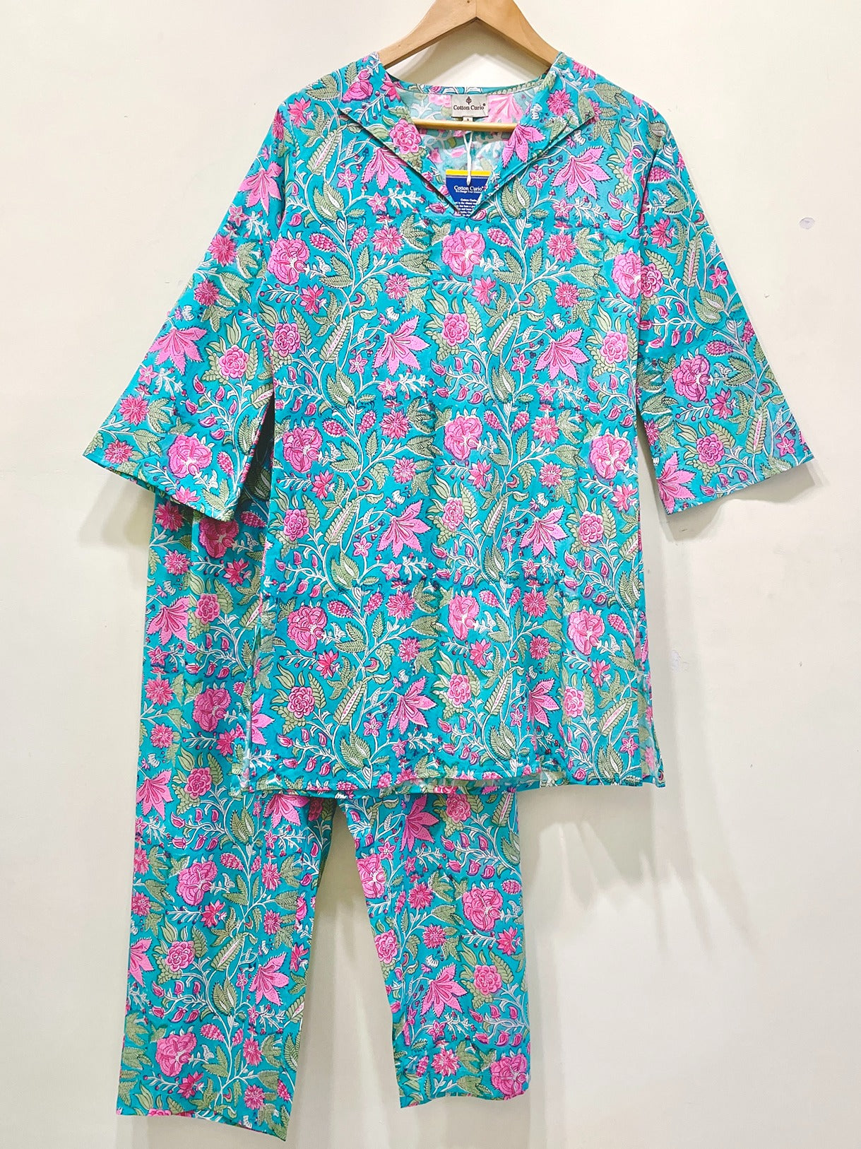 Step into effortless style with the Aqua Petal Co-ord Set. Featuring a lively floral print in shades of pink and green on a refreshing turquoise base, this set includes a relaxed-fit top with three-quarter sleeves and matching straight-cut pants. Crafted from soft, breathable fabric, it’s perfect for lounging at home or making a statement on casual outings. Embrace comfort and color with this eye-catching ensemble!