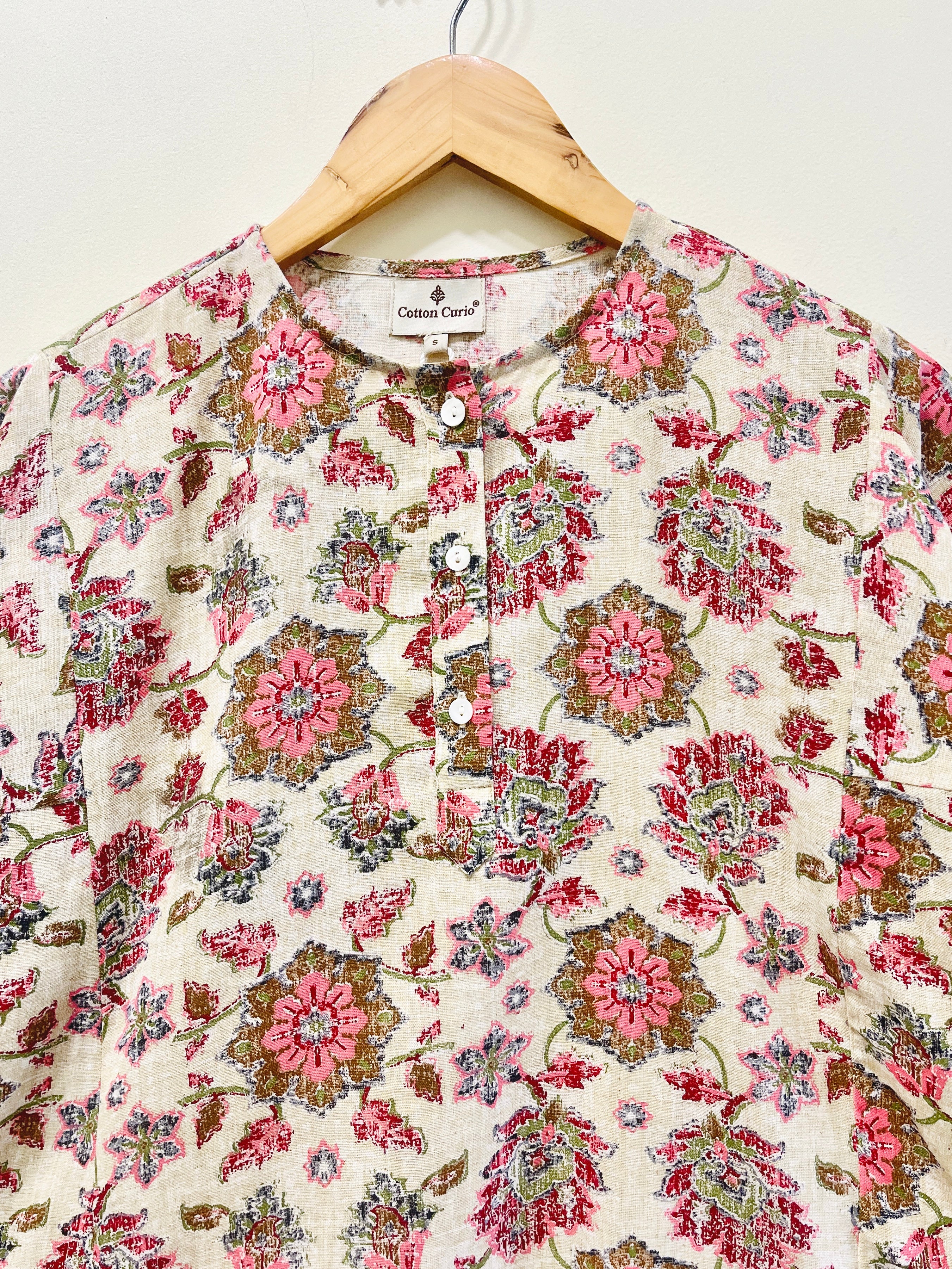 Embrace timeless elegance with the Rosy Meadow Cotton Kurti. Crafted from premium, breathable cotton, this kurti features a charming floral print in soft pink and green hues on a subtle beige background. The straight silhouette offers a flattering fit for all body types, while the three-quarter sleeves and round neckline add a touch of sophistication. Delicate button detailing at the front enhances its classic appeal. Perfect for both casual and semi-formal occasions, this kurti pairs effortlessly with trousers, leggings, or jeans. Experience all-day comfort and effortless style with this versatile wardrobe essential.