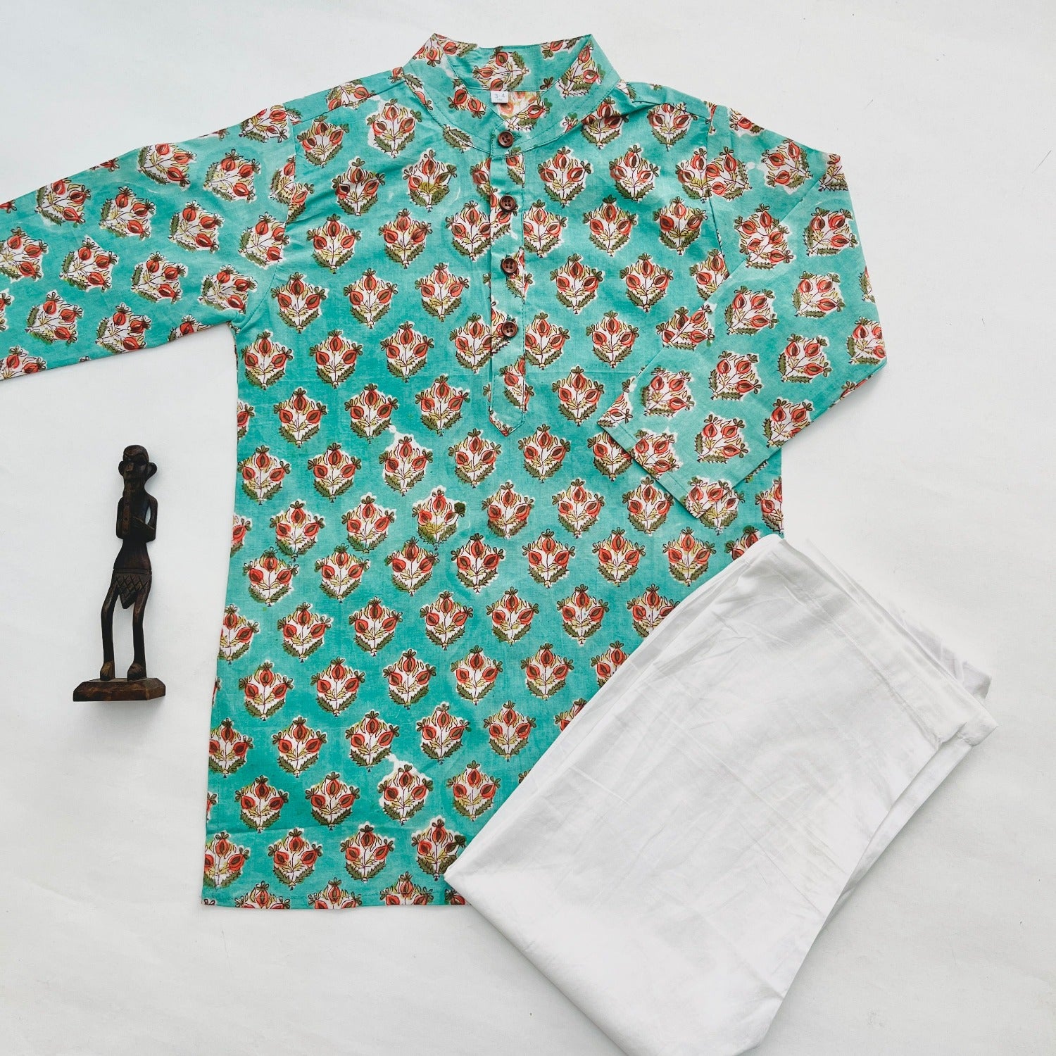 Elevate your child's festive wardrobe with our Cotton Printed Boys Kurta with White Pant, adorned with a sophisticated hand block print. Crafted from 100% cotton cambric, this outfit ensures both style and comfort. The traditional buti print adds a touch of elegance, making it perfect for special occasions. Dress your child in this exquisite green kurta for unforgettable festive moments.