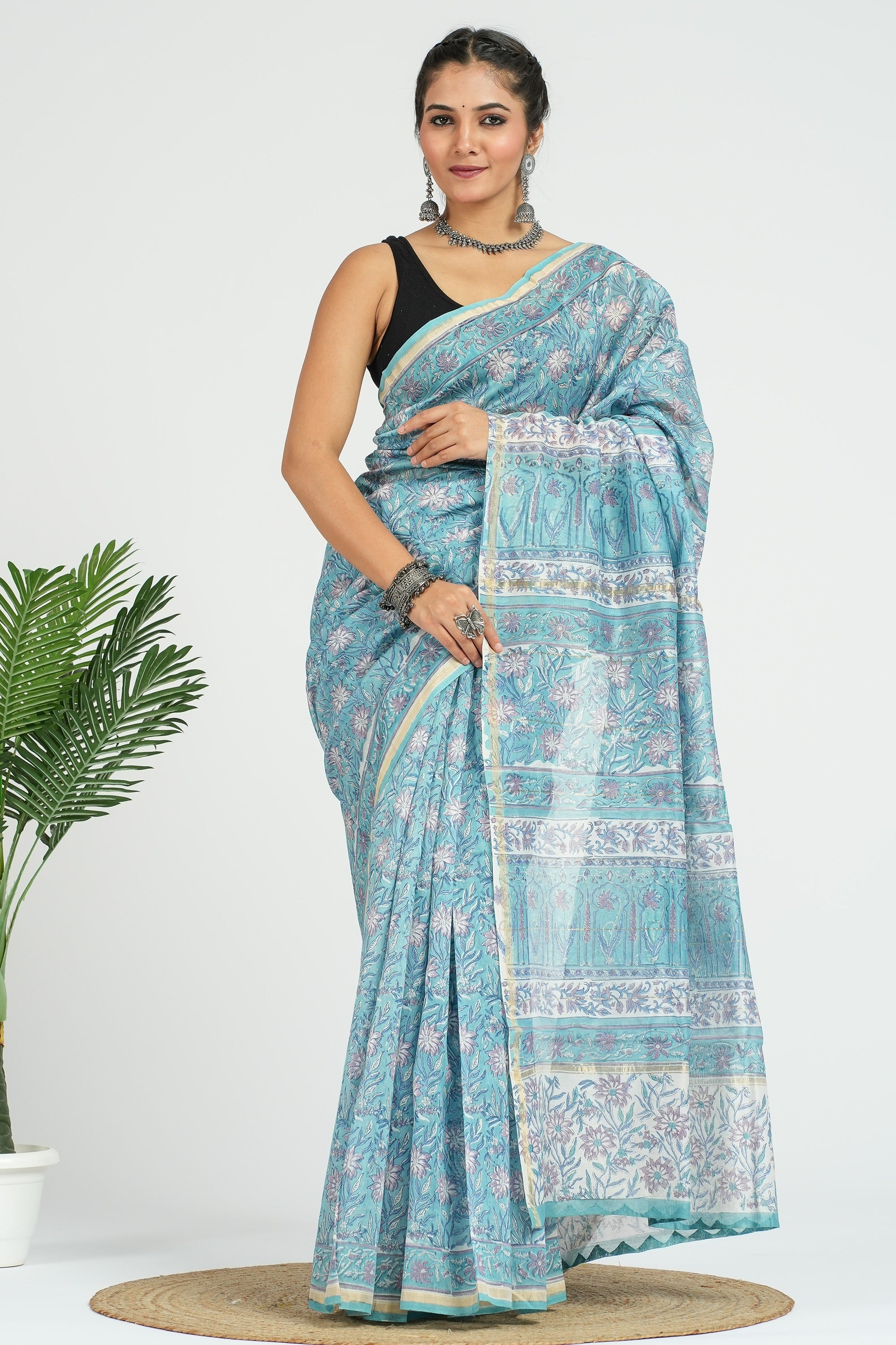 Exquisite elegance woven with intricate hand block patterns and shimmering silk, embodying the timeless grace of Indian tradition. Crafted with meticulous care and attention to detail, this saree drapes effortlessly, enhancing your silhouette with grace and poise. Whether it's a wedding celebration, an evening soirée, or a special occasion, the "Whispering Romance" saree will weave an irresistible spell of romance around you, captivating hearts and igniting the imagination.