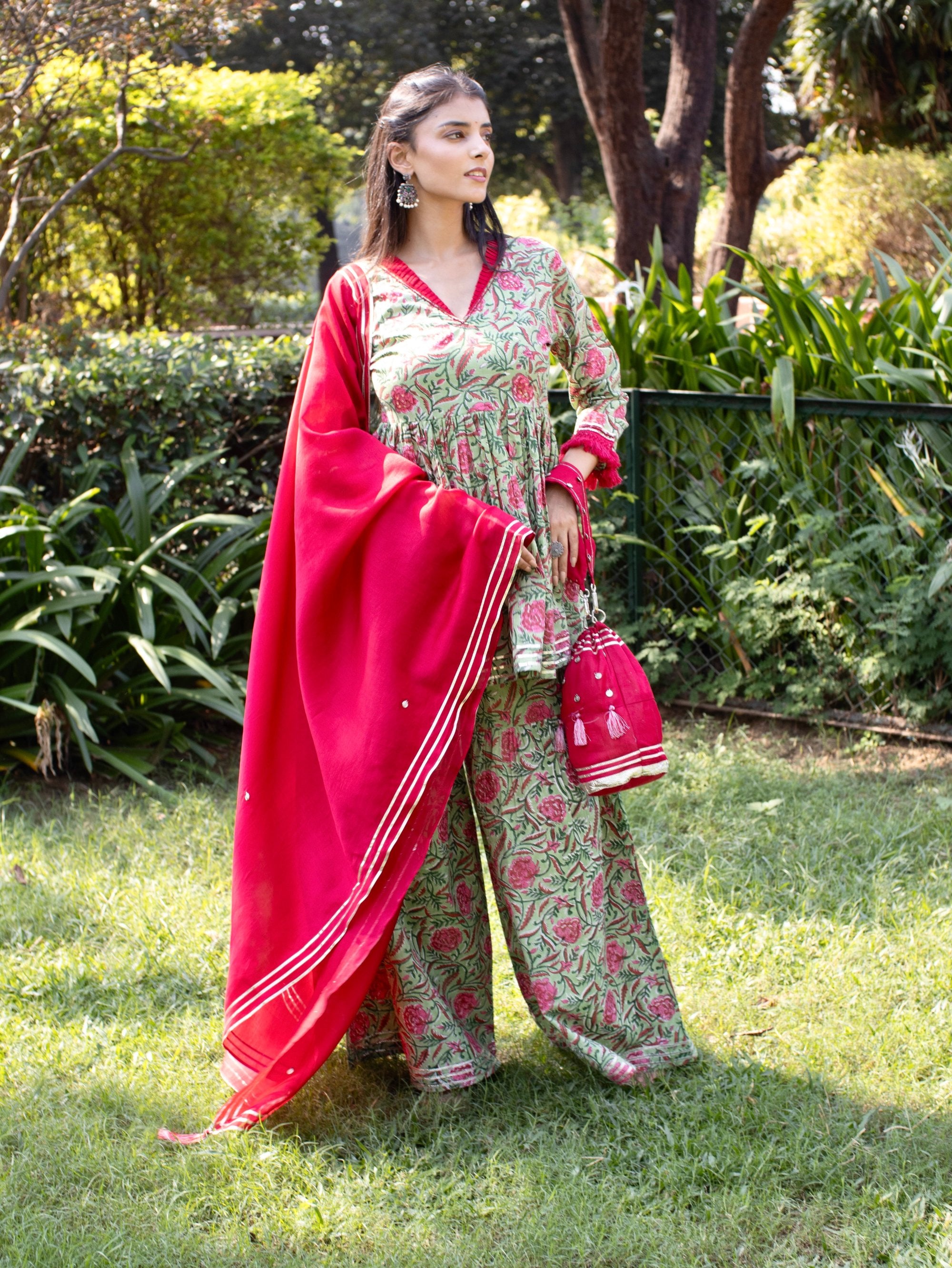 This stunning garara suit set features a rich green and wine red hand block printed cotton cambric 60's fabric for effortless style and comfort. The solid wine red Chanderi dupatta, adorned with intricate hand embroidery and beadwork, adds a touch of regal elegance to this festive ensemble. It's the perfect fusion of tradition and sophistication for any special occasion.