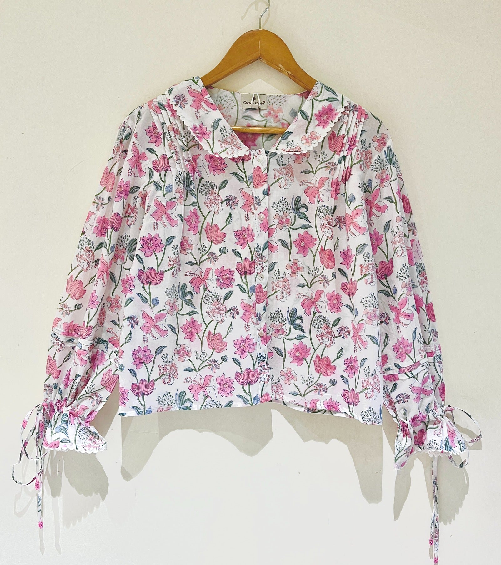 Crafted with love and tradition, this hand block printed cotton short top is a timeless blend of heritage and charm. Featuring delicate lace details, soft gathered sleeves with playful tie-ups, and beaded drawstrings that add a touch of whimsy. The button-down front and round collar adorned with intricate lace make it effortlessly chic.