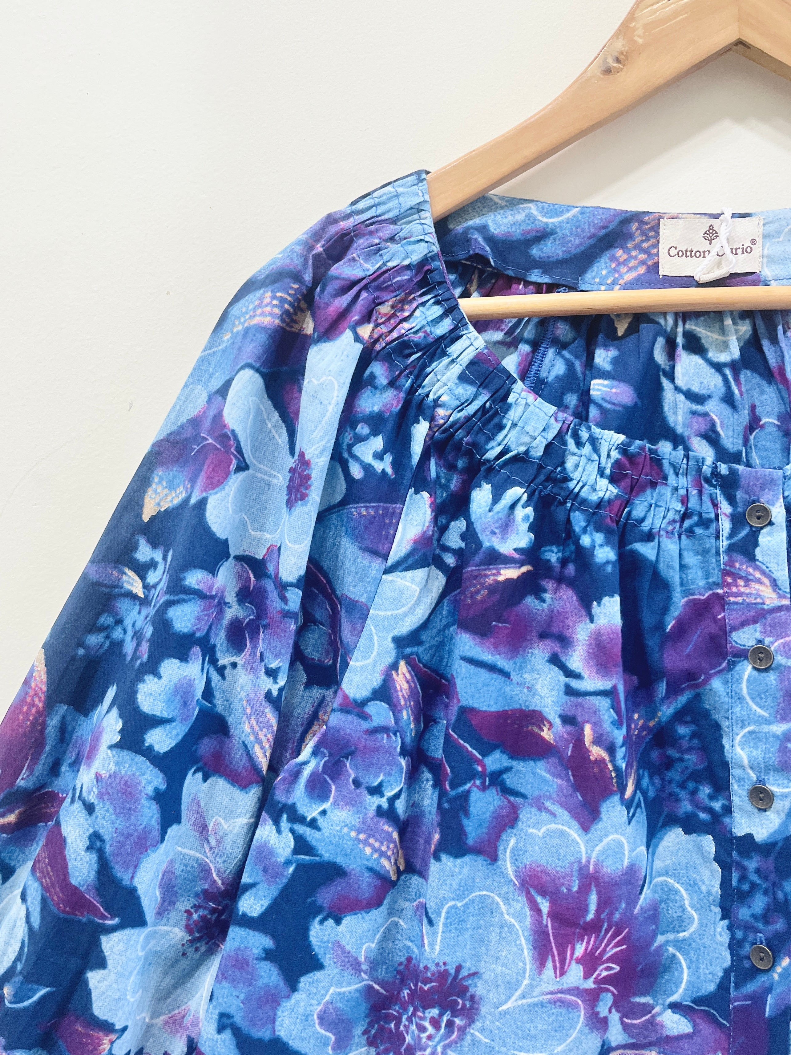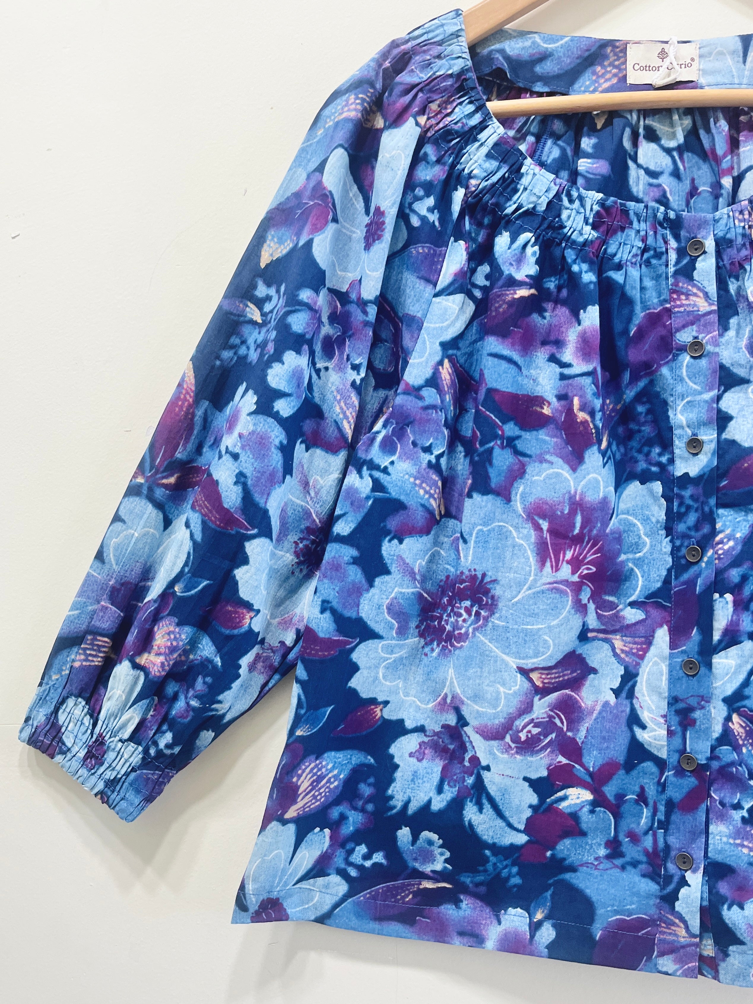 Step into effortless elegance with our Enchanted Printed Short Top . Crafted from soft, breathable cotton, this top features a stunning mix of blue and purple floral prints that bring a refreshing touch to your wardrobe. The relaxed fit, gathered neckline, and 3/4 puff sleeves with elastic cuffs offer both comfort and style. Perfect for casual outings or a polished daytime look, this blouse pairs beautifully with white trousers, jeans, or skirts.