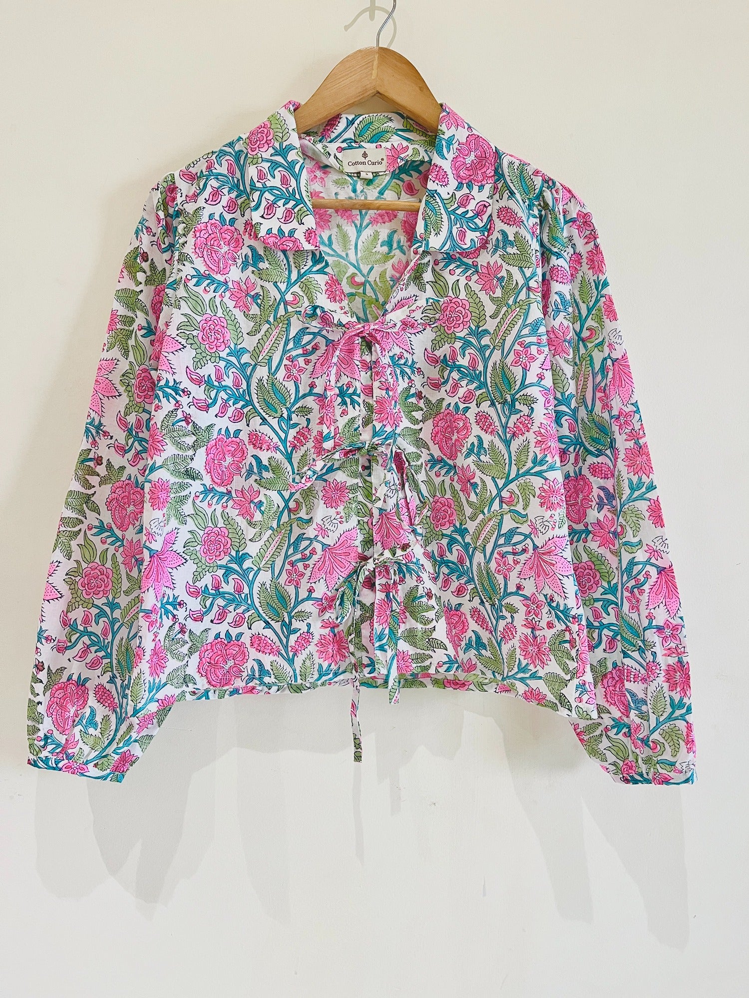 Get ready to fall in love with this super cute cotton top! With its Pinterest-worthy style, it features a sweet tie-front, a collar round neck, and adorable balloon full length sleeves with elastic cuffs. The length is just right at 22-25", perfect for pairing with your favorite high-waisted jeans. Ships within 2-3 days.